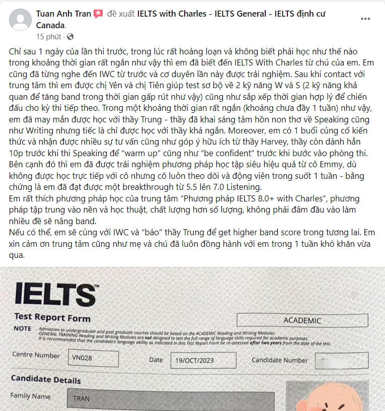 IELTS with Charles - British Academy Vietnam cảm ơn sự tin tưởng của thầy Trung trên chặng đường đồng hành cùng học viên chinh phục mục tiêu IELTS thành công, hiện thực hóa giấc mơ Du học, Định cư, Tuyển thẳng Đại học…