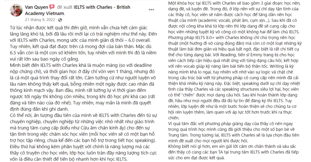 Chất lượng đã được chứng minh rất rõ trong suốt nhiều năm qua. IELTS with Charles rất tự hào vì là 1 phần trong sự thành công của tất cả các học viên, là 1 người đồng hành có tâm và có trách nhiệm.
