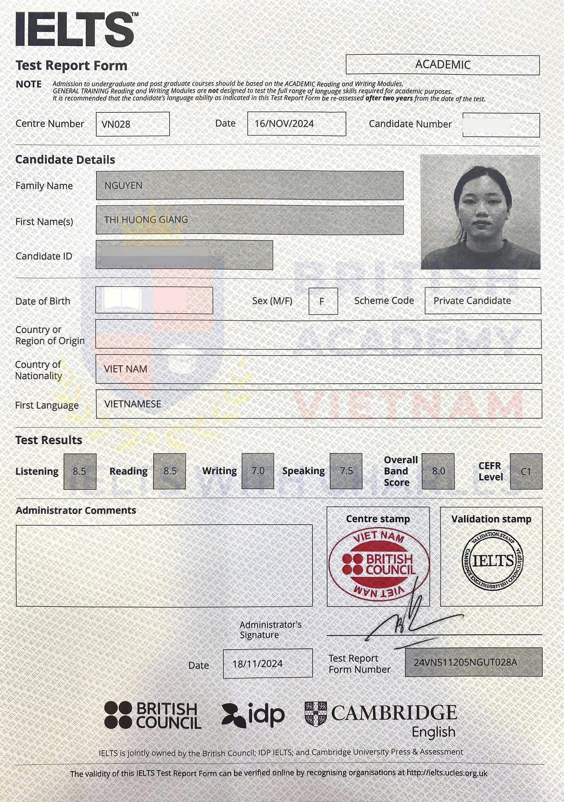 Bảng điểm đạt IELTS Academic 8.0 của Hương Giang sau khoá học tại IELTS with Charles