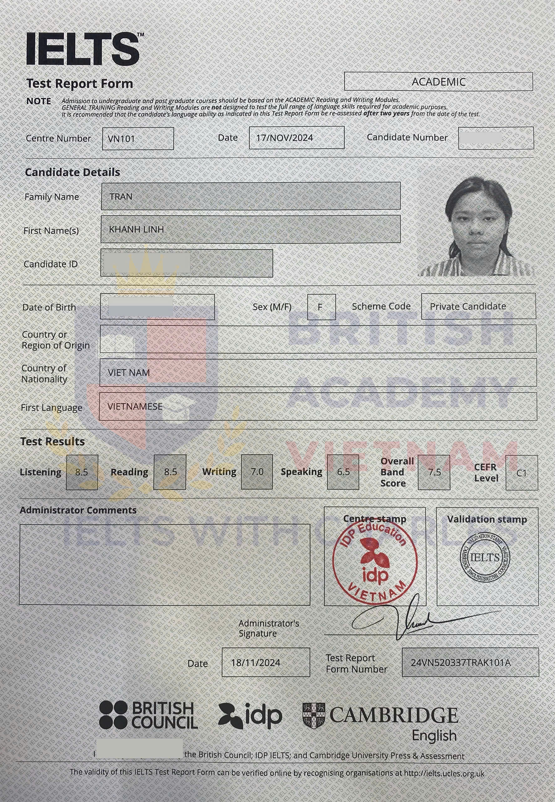 Bảng điểm đạt IELTS Academic 7.5 của Khánh Linh