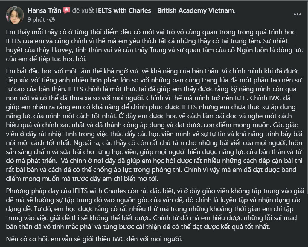 “Phương pháp dạy của IELTS with Charles còn rất đặc biệt, vì ở đây giáo viên không tập trung vào giải đề mà sẽ hướng sự tập trung đó vào nguồn gốc của vấn đề, đó chính là luyện tập và nhận dạng các dạng đề. Từ đó, em học được rằng có rất nhiều thứ mà trong những khoảng thời gian em chỉ tập trung vào việc giải đề thì sẽ không thể biết được. Chính từ đó mà em hiểu được những lỗi sai mad bản thân đã vô tình mắc phải và từng bước cải thiện để có thể đạt được kết quả tốt nhất.”