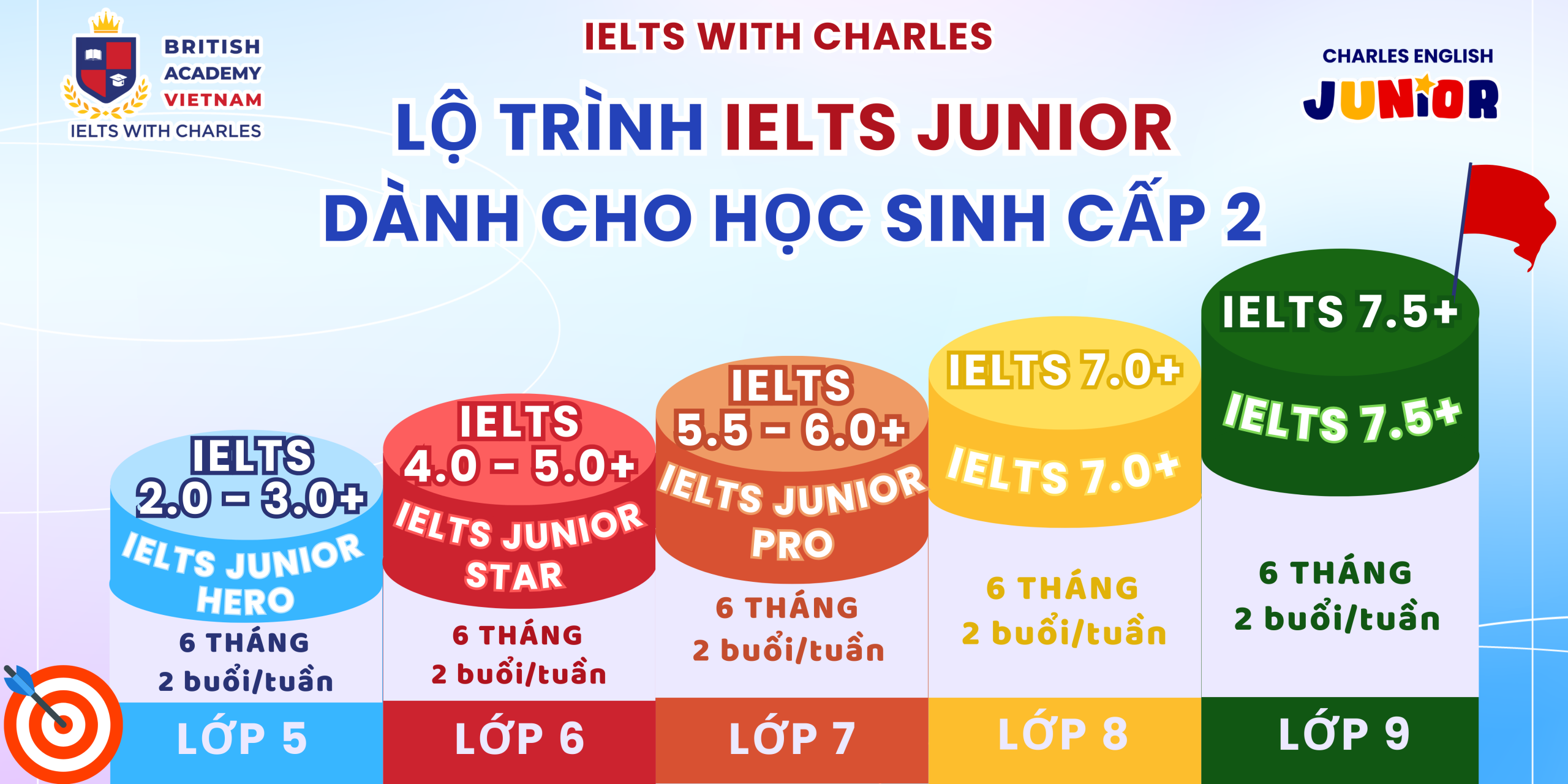 IELTS Junior chính là “bước đệm vàng” giúp học sinh 10-15 tuổi xây dựng nền tảng tiếng Anh học thuật vững chắc và chuẩn bị sớm cho kỳ thi IELTS. Với lộ trình cá nhân hóa, đội ngũ giáo viên chất lượng cao và phương pháp giảng dạy hiện đại, IELTS With Charles cam kết mang đến trải nghiệm học tập hiệu quả, tạo tiền đề cho thành công học tập và sự nghiệp trong tương lai.