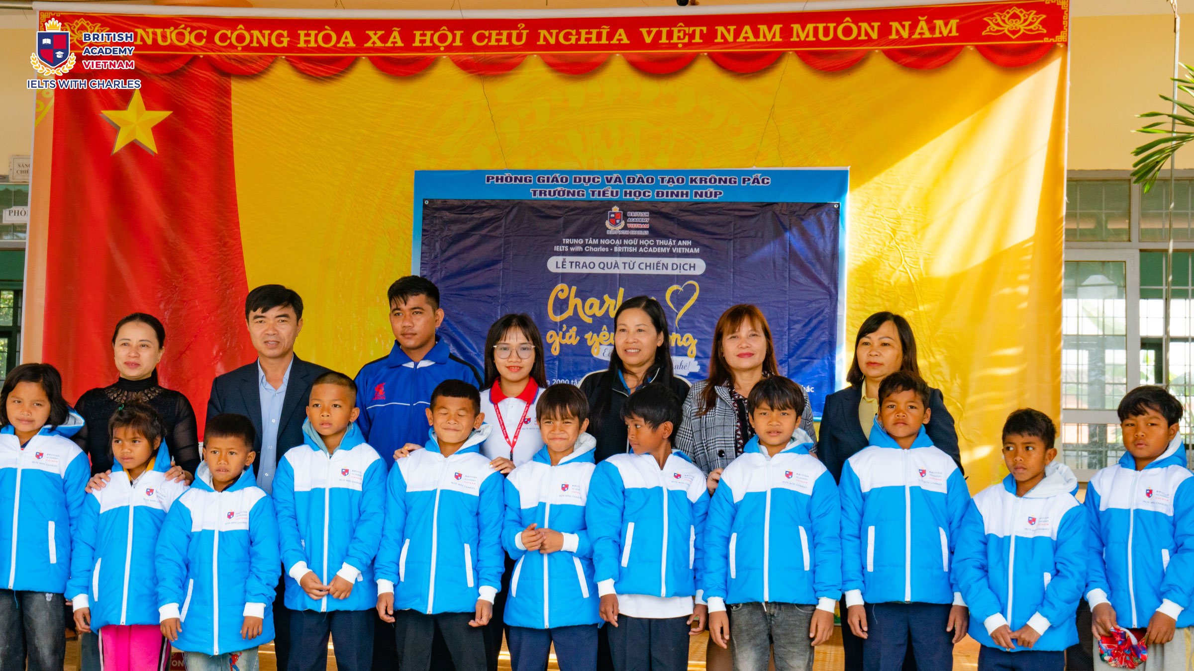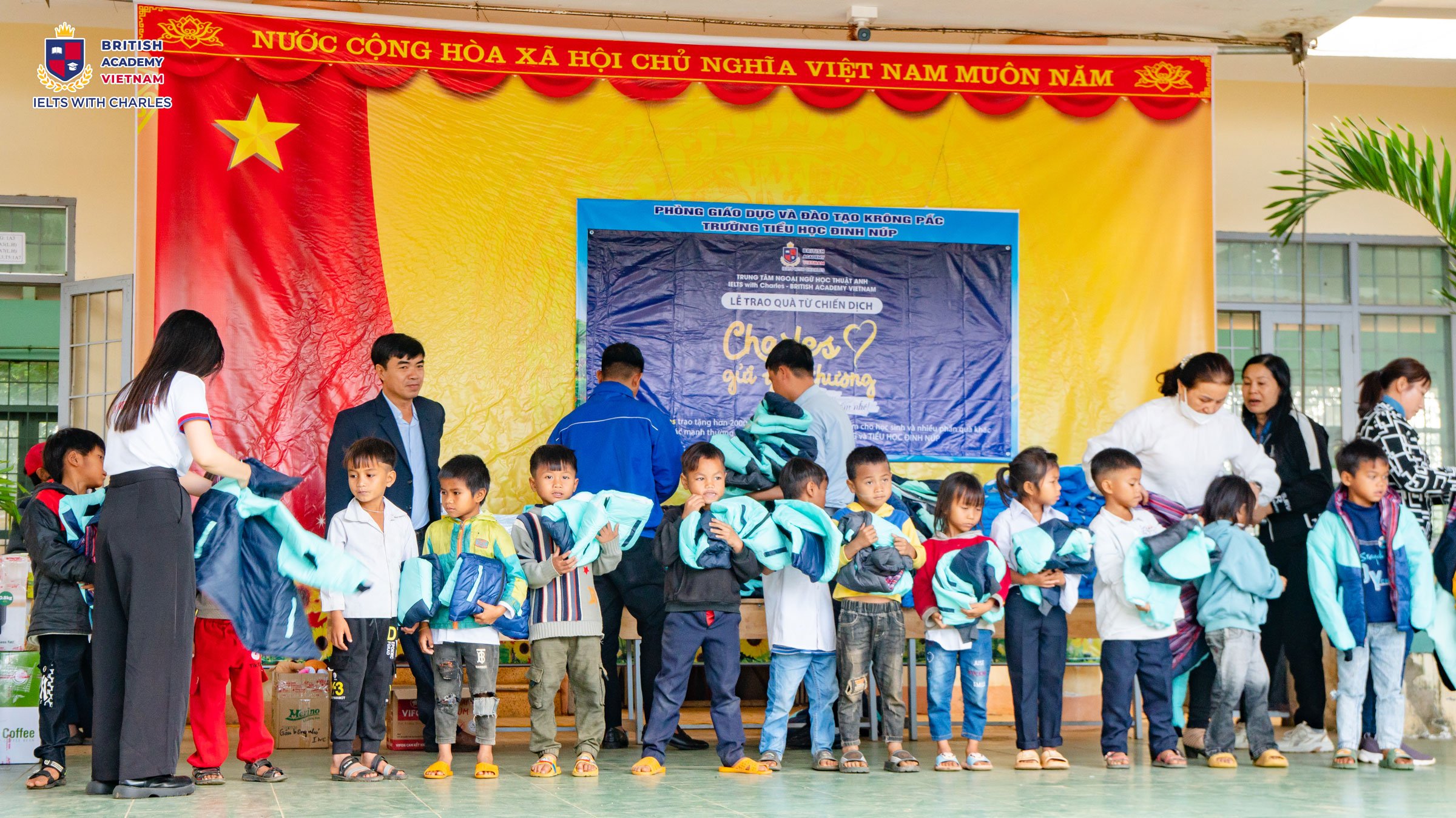 Xuất phát từ mong muốn trao gửi yêu thương và mang hơi ấm đến các em trong mùa Noel ấm áp này, IELTS with Charles đã kêu gọi ủng hộ, giúp đỡ của các nhà hảo tâm để tổ chức Dự án “CHARLES GỬI YÊU THƯƠNG – Ea Yieng ơi! Đông ấm nhé!” trao áo ấm, tập vở,… đến các em học sinh tại điểm Trường THCS Ea Yiêng, Trường Tiểu Học Đinh Núp và các trẻ em nhỏ trong buông với: Tập học sinh 2232 quyển; Áo ấm 302 (áo cấp 1, áo cấp 2, áo mầm non); Gấu bông nhỏ 60 con; Móc khóa 20 cái.