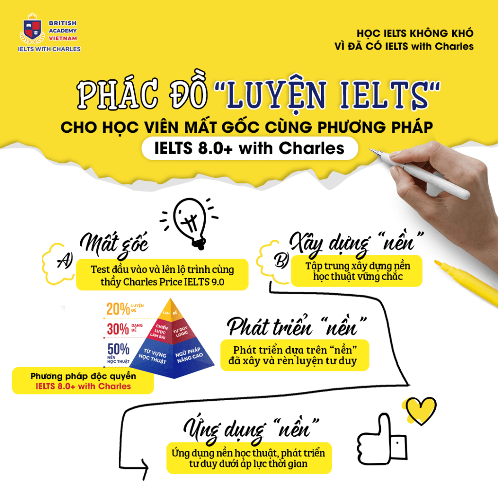 Phương pháp IELTS 8.0+ with Charles chú trọng xây dựng nền tảng học thuật cho học viên ở 4 kỹ năng. Phương pháp này không tập trung giải đề quá nhiều mà hướng học viên chắc kiến thức nền tảng, kiến thức học thuật IELTS, xây dựng nền ngữ pháp, phát âm ngay từ ngày đầu tiên học.
