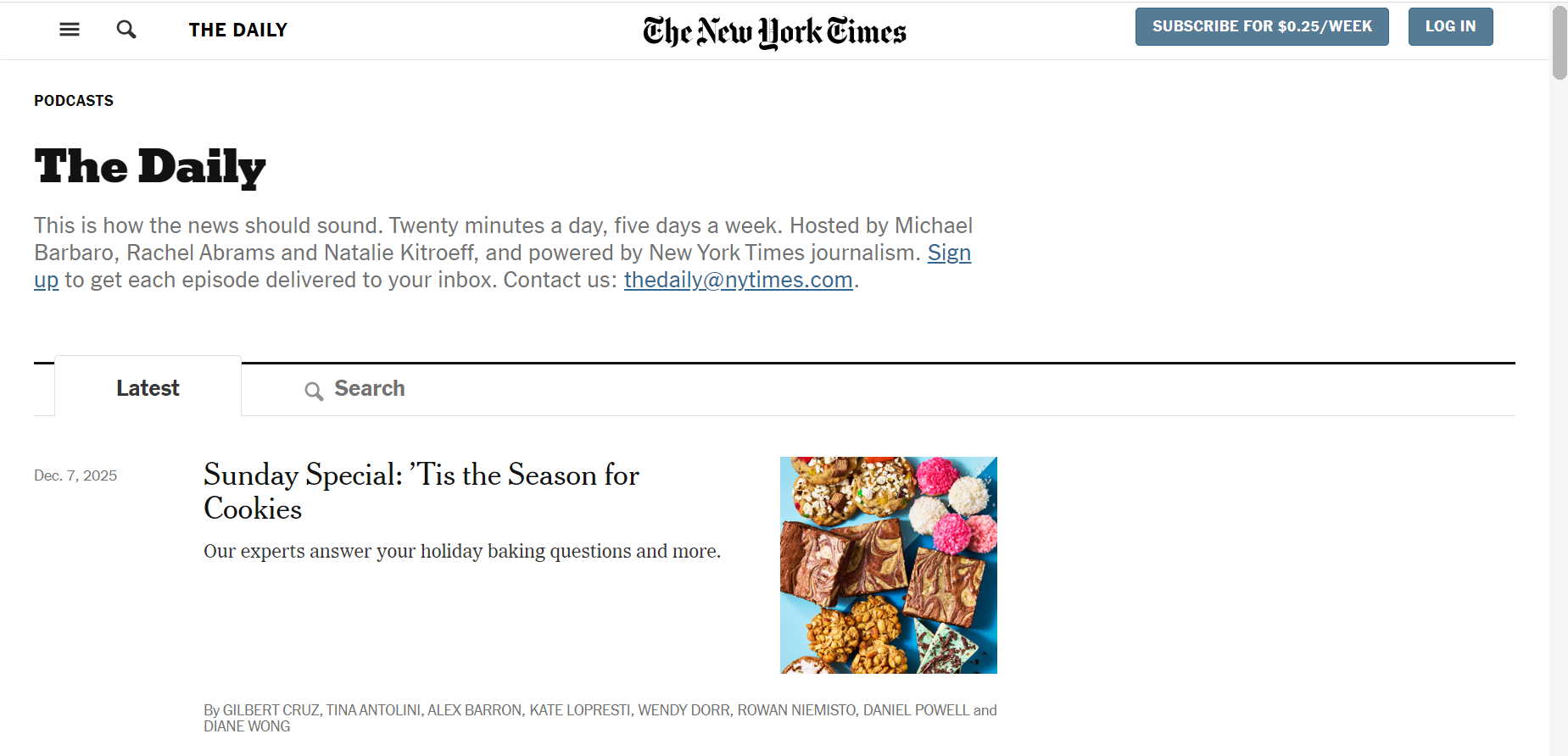 Podcast được dẫn dắt bởi Michael Barbaro cùng đội ngũ phóng viên kỳ cựu của The New York Times. Nhờ vậy, mỗi tập đều có chất lượng nội dung cao, phong cách kể chuyện lôi cuốn và góc nhìn báo chí sắc bén. Thời lượng khoảng 20 phút/tập vừa đủ để đào sâu một vấn đề nhưng vẫn phù hợp để nghe trong lúc di chuyển hoặc nghỉ ngơi.