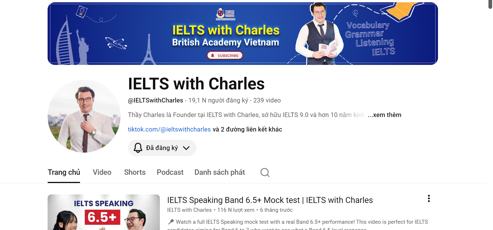 Nếu bạn muốn biến việc nghe podcast trở thành công cụ chinh phục IELTS hiệu quả hơn, đừng quên ghé thăm kênh YouTube IELTS With Charles. Tại đây, thầy Charles sẽ hướng dẫn chi tiết cách luyện Speaking, mở rộng Vocabulary, cải thiện Pronunciation và áp dụng chiến lược làm bài cho từng kỹ năng. Với các video ngắn 10 – 20 phút, dễ theo dõi và thực hành ngay, bạn sẽ biến kiến thức từ podcast thành kỹ năng thực tế, tiến gần hơn đến band điểm mơ ước.