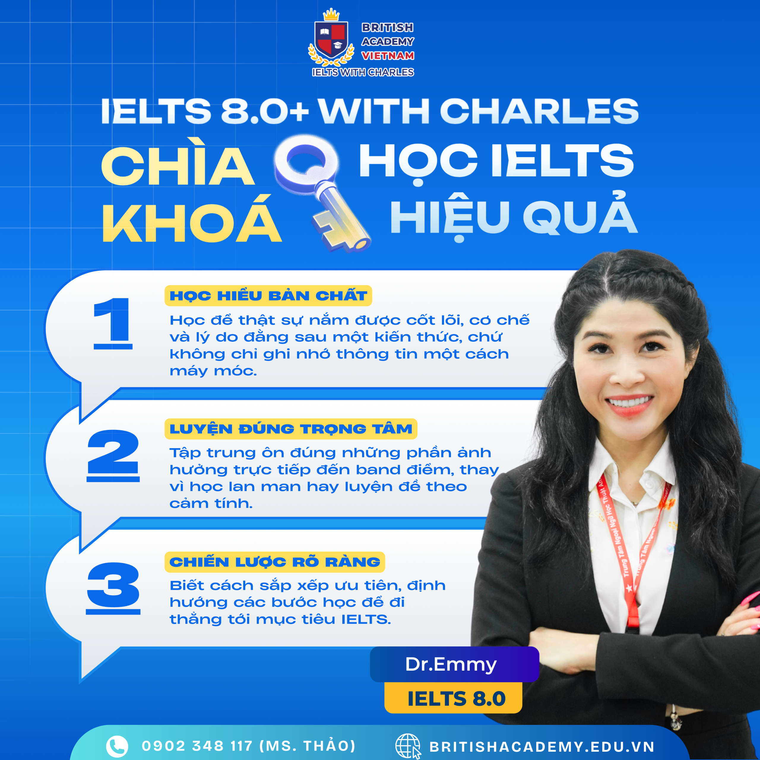 IELTS with Charles là trung tâm luyện thi IELTS uy tín tại TP.HCM trực thuộc British Academy Vietnam được thành lập từ tháng 04/2018 tại London, Anh Quốc bởi Founder Thầy Charles IELTS 9.0 – Người Anh và Tiến sĩ Emmy IELTS 8.0 với sứ mệnh: giúp người Việt ở mọi trình độ đạt IELTS trong thời gian ngắn nhất. Đặc điểm nổi bật của IELTS with Charles không chỉ là sự cam kết về chất lượng đào tạo mà còn là môi trường học tập lý tưởng, nơi mà học viên không chỉ nắm vững kiến thức mà còn phát triển tự tin và kỹ năng ngôn ngữ.